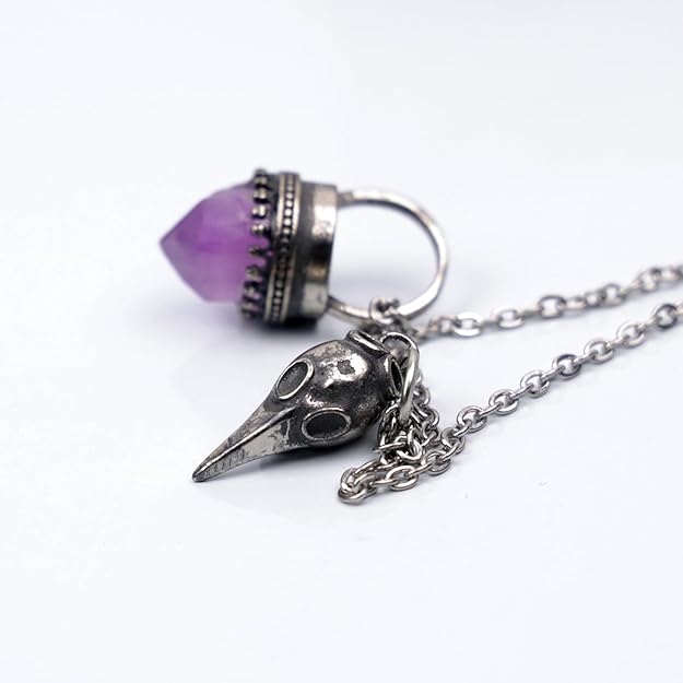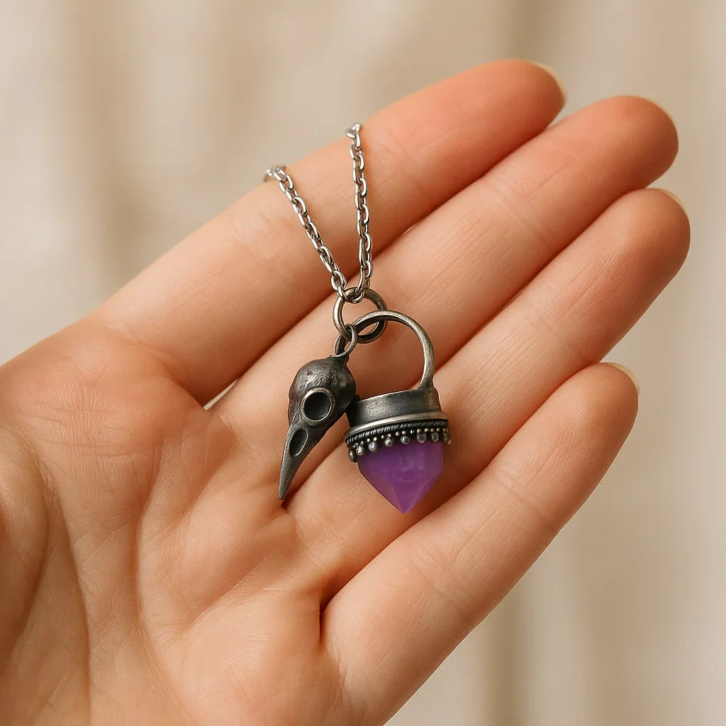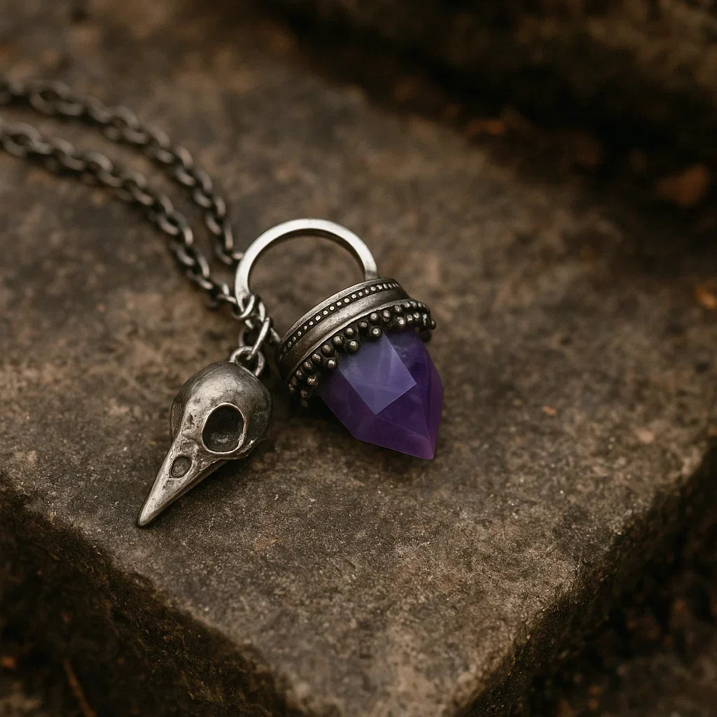Cada detalle del colgante ha sido elaborado con precisión: desde la textura realista del cráneo hasta el brillo profundo de la amatista incrustada, lo que lo convierte en una joya distintiva, ideal tanto para amantes de lo gótico y lo esotérico.