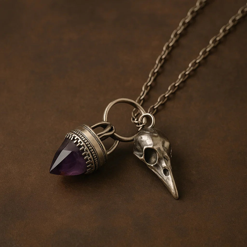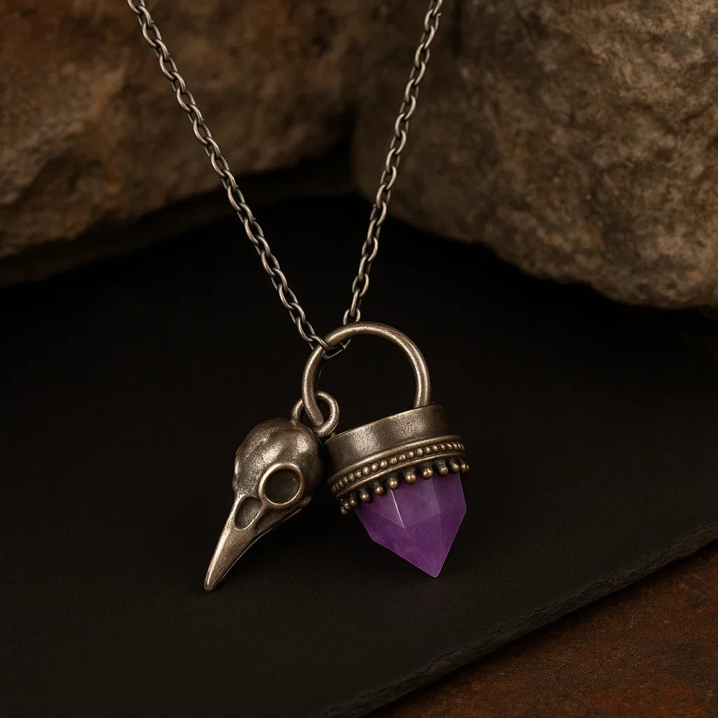 Su diseño único combina la fuerza de la calavera de cuervo con la energía de la amatista natural, piedra reconocida por sus propiedades de calma, claridad mental y protección contra energías negativas.
