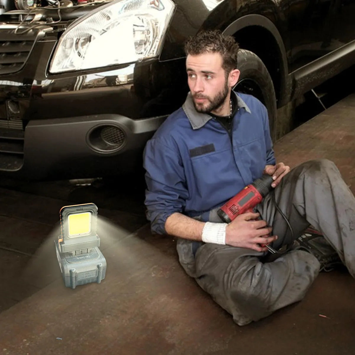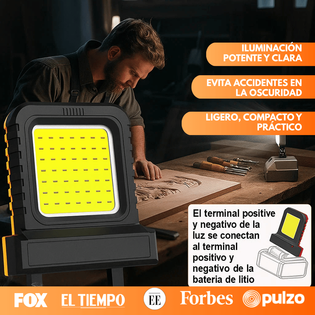 Este innovador reflector aprovecha la energía de las mismas baterías que ya usas en tus herramientas eléctricas, evitando que tengas que comprar baterías adicionales o depender de tomacorrientes.